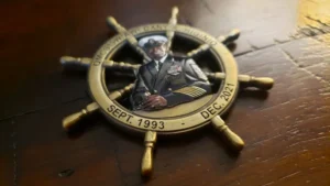 The rise of premium materials is unmistakable this year. Polished gold, antique nickel, and dual plating create coins with a sense of gravitas and history. One standout example is the U.S. Navy QMC Challenge Coin, crafted for a Chief Quartermaster. The coin’s wheel-shaped design and antique finish show how a unique silhouette and carefully chosen plating can elevate a story of leadership and dedication.