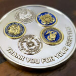 As normal coin goes, we put their emblem on one side, and the insignias of the armed forces on the other, and a bit of American flag ornaments and a bit of inscriptions on both sides. To achieve the modern look, we choose shiny silver colored finishing for the back side, and a diamond pattern with a bit of gold on the edge for the front. The font chosen for the letterings and the streamlined shaped flags as the accents help it to achieve a timeless, yet contemporary look.