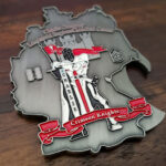 This coin was built for the LRMC Troop Command’s Charlie Company. They asked for something unique and unordinary custom challenge coin, that is shaped like the map of Germany, where the LRMC is located. They also wanted to put an image of a knight and a castle on one side, and their insignias on the other side.