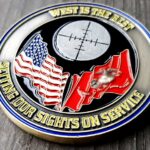 The back of the coin captures the customers pride in country and Marine Corps, while the scope complements the importance of continuing to serve. The finish on this commemorative coin is antique gold. The blue, gold, and yellow color combination complement each other well, fitting in well with the reds and blacks also found throughout.