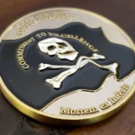 They wanted an image of a submarine with the PEO CLB letters on one side, and the graphic style, as you can see, is more of a contemporary graphic design, with some accents from the US Flag’s Star & Stripes. And on the other side, they wanted to put the engraved image of the black flag with the crossbones, with the inscription of their admiral’s name and their motto on the edge of the coin. The result is one awesome custom challenge coin.